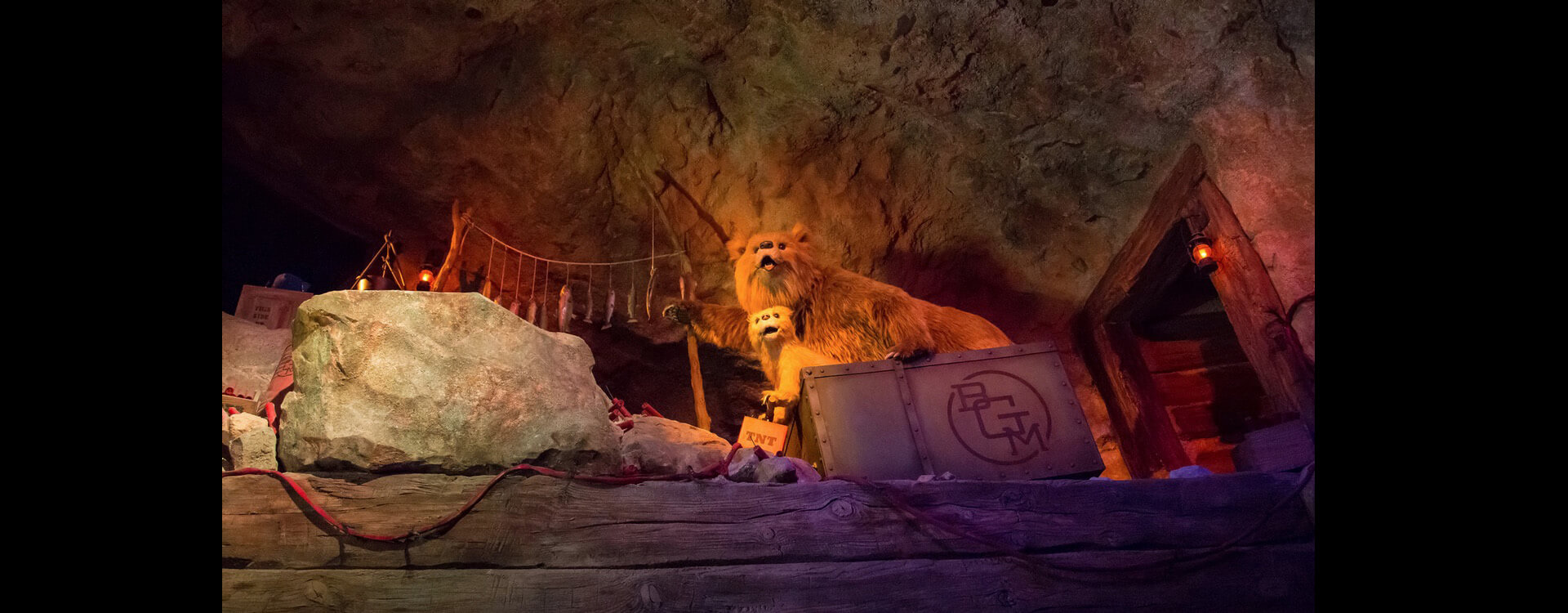 This rollercoaster attraction ride features animated bears as well as reversed direction track in the finale part of the ride. Two animated bears, a mother and cub named Mother Lode and Nugget, are located inside the mine and the cub sets off some TNT while reaching for a hanging catch of fish left behind by one of the miners, causing the train to launch out of the mine on yet another track. The train then goes through a variety of twists and turns before arriving at the terminal brake run and returning to the station, passing by a damaged mine car containing Mother Lode, Nugget and the fish.